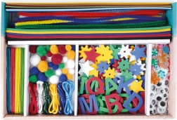 Farbiges Papier, Moosgummi-Teile, Chenilledraht, Wackelaugen, Pompons, Holzstäbchen für Eis, Knöpfe und weitere Kleinteile