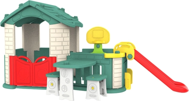Das Spielhaus bietet viele Spielmöglichkeiten mit integrierter Rutsche, Basketballkorb und Garten mit Zaun.