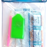 Für reibungsloses Arbeiten ist die Oberseite der Leinwand mit Klebstoff beschichtet und durch eine Folie geschützt – ziehen Sie diese schrittweise ab, damit die Steinchen besser haften. Nehmen Sie etwas Wachs in die Stiftspitze, schütten Sie die Steinchen in die Schale und setzen Sie sie gemäß der Legende an die richtigen Stellen.