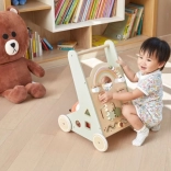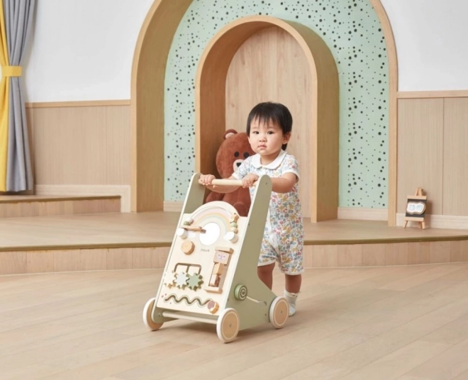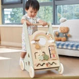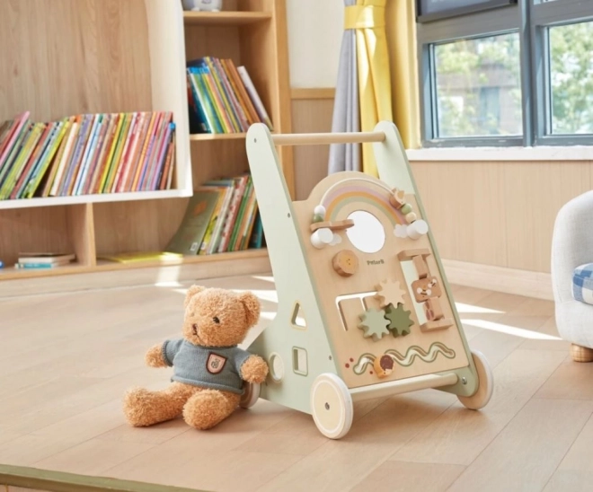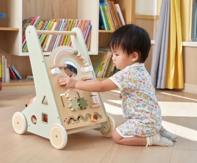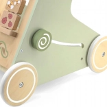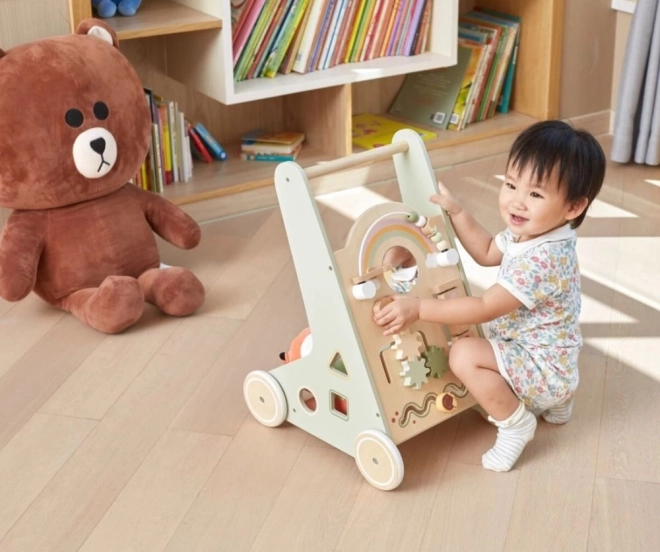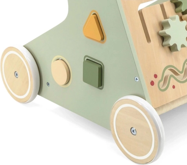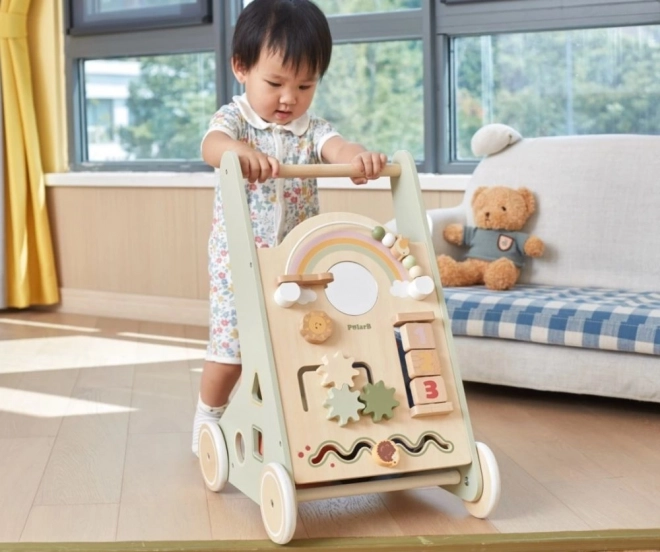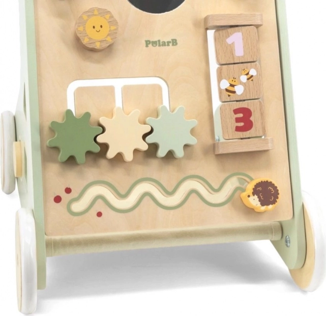 Der Holz-Schiebelauflernwagen PolarB Viga wurde so gestaltet, dass er Kinder sicher bei ihren ersten Schritten begleitet und gleichzeitig zum Entdecken motiviert. Das Frontpanel bietet zahlreiche Aktivitäten – von drehenden Zahnrädern über Schiebelabyrinthe bis hin zu Formensortierung und Spiegel, die Sinne und logisches Denken spielerisch fördern.