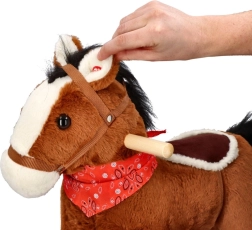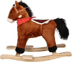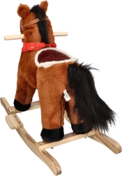 Das braune Schaukelpferd mit weicher Plüschoberfläche, Sattel und dekorativem Halstuch ist der ideale Begleiter für den Alltag. Dank der stabilen Holz-Wippe kann das Kind sicher schaukeln, die Motorik fördern und die Koordination üben.
