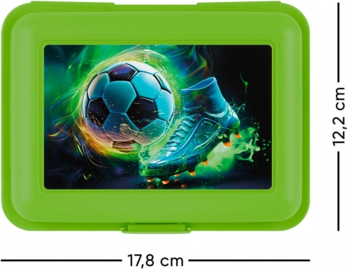Halten Sie Ihre Brotzeit frisch und übersichtlich organisiert. Diese grüne Box mit attraktivem Fußball-Design ist perfekt für Kinder und Erwachsene, die einfache Handhabung und einen zuverlässigen Verschluss schätzen.