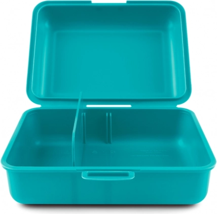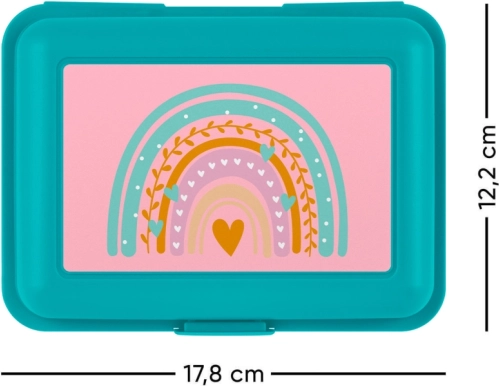 Verleihen Sie Ihrer Pause einen stilvollen Moment mit unserer Brotdose Regenbogen in türkis. Diese funktionale Plastikdose ist dank einer Ein-Verschluss-Verriegelung und einer praktischen inneren Trennwand ideal für den täglichen Gebrauch. Die Dose ist so konzipiert, dass sie robust und leicht transportierbar ist, was sie zu einem großartigen Helfer für Schule und Arbeit macht.