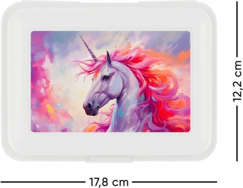 Die Kunststoffbox ist mit einem farbenfrohen Einhornmotiv in lebendigen Rosa- und Violetttönen verziert, das besonders Kinder anspricht und erfreut.