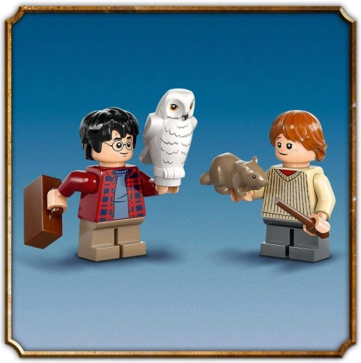 Enthalten sind die Minifiguren Harry Potter und Ron Weasley, die Figuren Hedwig und Krätze, Zauberstäbe und ein Koffer – alles für magische Abenteuer.