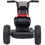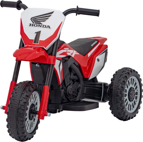 Dieses lizenzierte Kindermotorrad, inspiriert vom Modell Honda CRF 450R, ist ideal für die ersten Fahrten im Garten oder zu Hause. Die Dreirad-Konstruktion sorgt für hohe Stabilität und Sicherheit beim Anfahren, während Kunststoffräder mit Gummilauffläche besseren Grip und eine leisere Fahrt bieten.