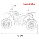 Die einfache Bedienung mit Vorwärtsfahrt sowie Hupen- und Start-Soundeffekten zaubert jedem kleinen Motocross-Fan ein Lächeln ins Gesicht. Dank der kompakten Maße (L 70 × B 41 × H 50 cm) und des Gewichts von nur 4,6 kg ist das Motorrad leicht zu transportieren und für Kinder mit einer maximalen Belastung bis 25 kg geeignet.