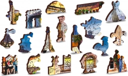 Puzzles enthalten Teile, die bekannte Gebäude, Tiere und Objekte entsprechend dem thematischen Motiv darstellen.
