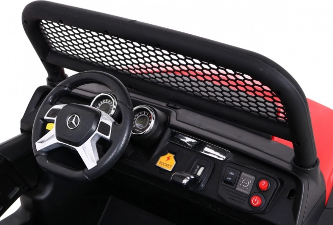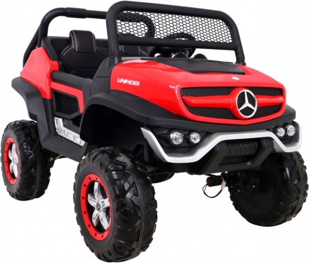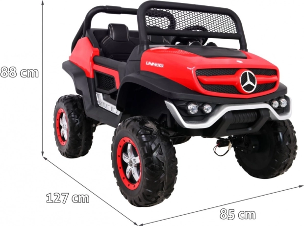 Der Mercedes Benz Unimog ist ein elektrisches Auto für Kinder, das dank seines starken 4x4-Antriebs ein aufregendes Fahrerlebnis bietet. Das Design ist von echten Offroad-Fahrzeugen inspiriert und enthält realistische Details, einschließlich LED-Lichtern und dem ikonischen Markenlogo. Mit der Möglichkeit, zwischen Zwei- oder Vierradantrieb zu wechseln, bietet es Flexibilität für verschiedene Terrains.