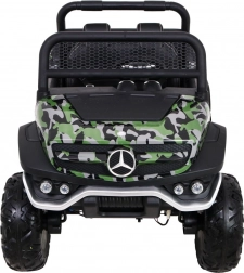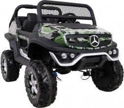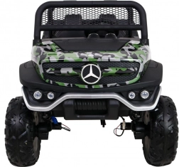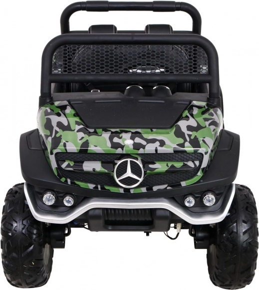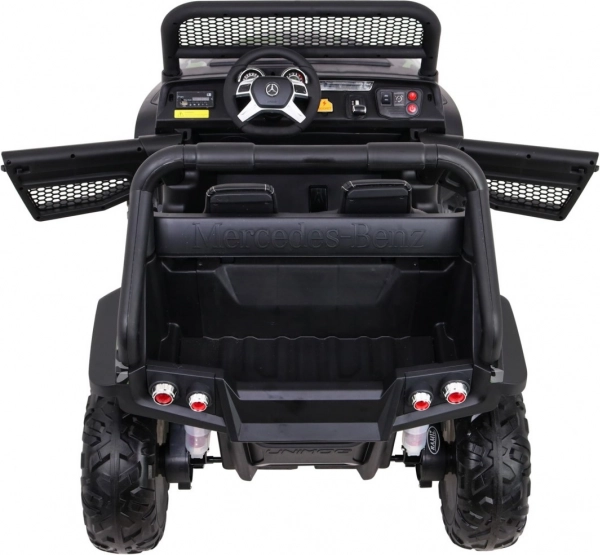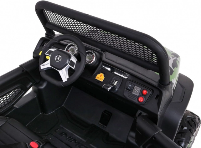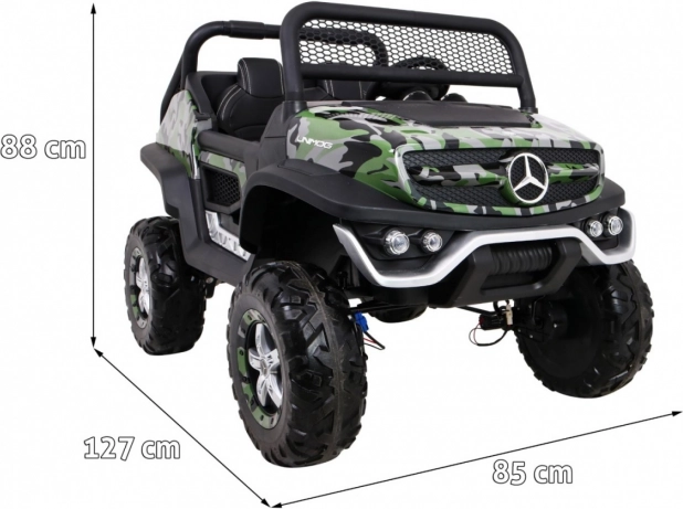 Der Unimog für Kinder ist mit vier starken Motoren ausgestattet, die einen reibungslosen Betrieb selbst auf unebenen Wegen gewährleisten. Dank MicroSD-Speicher, USB und Bluetooth kann das Kind während der Fahrt seine Lieblingsmusik hören.