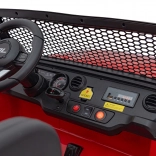 Zwei separate Sitze aus Kunstleder mit Sicherheitsgurten bieten Komfort für kleine Fahrer. Für ein realistisches Erlebnis sorgen vordere und hintere LED-Lichter, eine beleuchtete Starttaste und zu öffnende Türen. Das Audio-Panel mit MP3-, USB- und AUX-Eingang spielt Lieblingslieder ab, während die Tasten am Lenkrad Hupe und Melodien bieten.