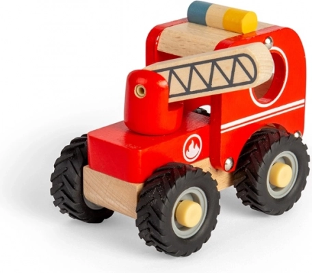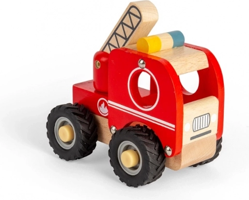 Holzfeuerwehrwagen für fantasievolles Spiel, ideal zur Förderung der Motorik und Hand-Auge-Koordination. Die Kombination aus rotem Lack und naturfarbenem Holz zieht jedes Kind an.