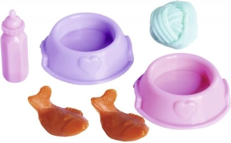 Im Paket finden Sie verschiedene Spielzeuge und Accessoires, die echte Tierbedürfnisse nachahmen, wie herzförmige Schüsseln oder einen Ball.