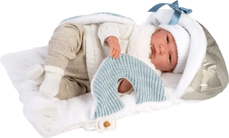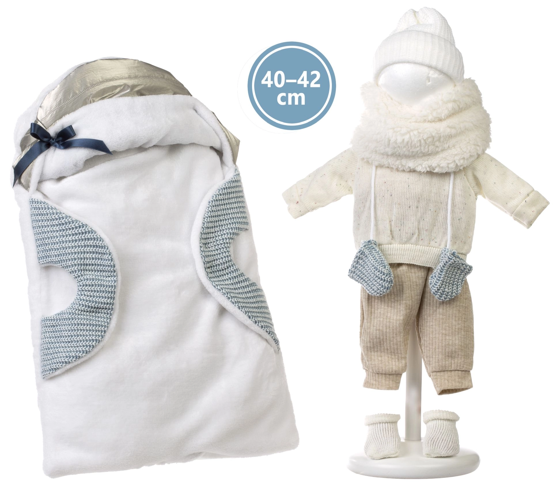 Alles Nötige in einem Paket: aufeinander abgestimmte Kleidungsteile und eine weiche Auflage mit Kapuze für die tägliche Pflege der Puppe.