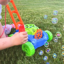 Der Rasenmäher imitiert das Rattern einer echten Maschine, ergänzt Blubbergeräusche und spielt zur maximalen Unterhaltung eine fröhliche Melodie ab.