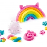 Im Set sind 4 farbige Knetmassen enthalten. Die Deckel jeder Dose dienen zugleich als Förmchen, mit deren Hilfe das Kind zweidimensionale Figuren von Fee, Lakotka, Najkotka sowie dekorative Elemente herstellen kann.