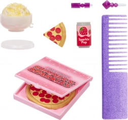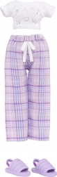 Violet trägt ein bequemes lila Pyjama im Karomuster, weiche Hausschuhe und ein Set an Snacks – Pizza, Popcorn, Teller und Getränk. Ideal für Themenszenen und Pyjama-Partys.