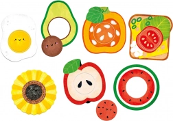 Das Spielen mit dem Puzzle fördert ganz natürlich die Feinmotorik, die Wahrnehmung und die Geduld. Gemeinsam könnt ihr Lebensmittel, Farben und Formen benennen, Ähnlichkeiten und Unterschiede suchen und Fragen erfinden wie „Was hat Kerne?“ oder „Wo ist das Ei?“. Ältere Kinder nutzen die Teile auch für Rollenspiele wie Laden oder Kochen oder als Inspiration für eigene Bilder.
