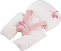 Die weiche Unterlage mit dekorativer Schleife und sicheren Gurten dient als praktischer Stuhl für einen stabilen Sitz der Puppe.
