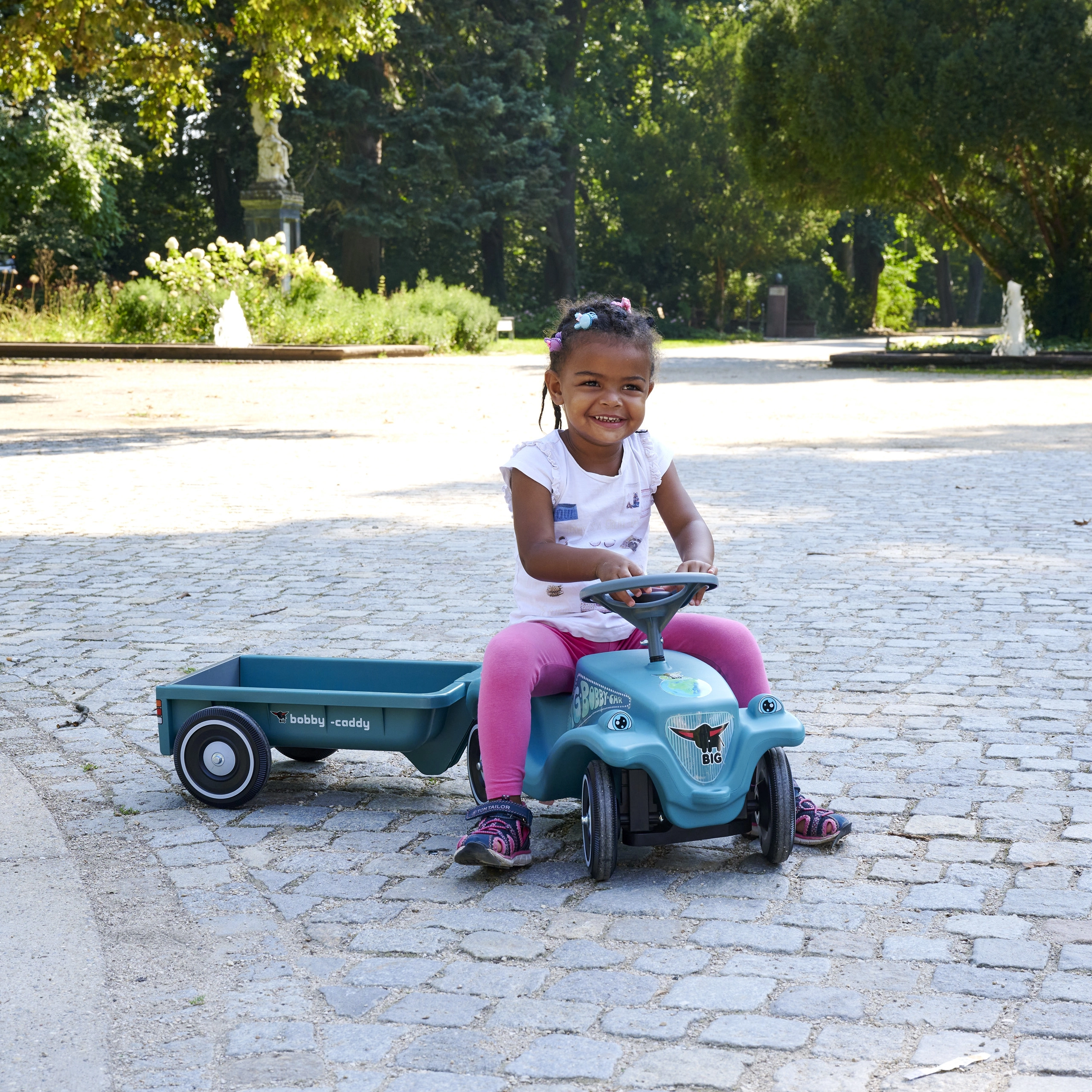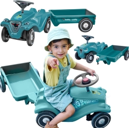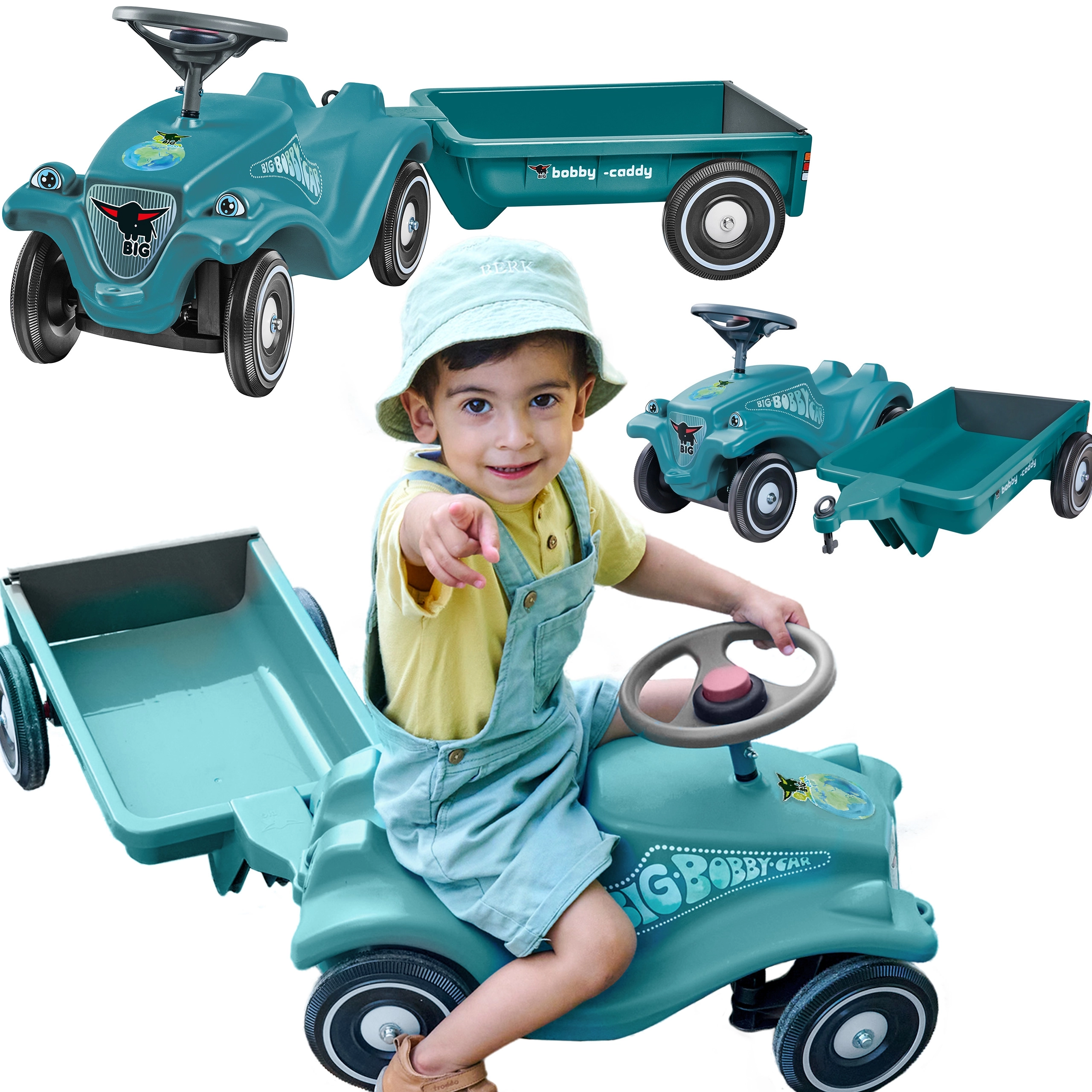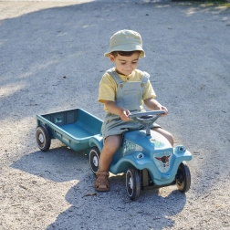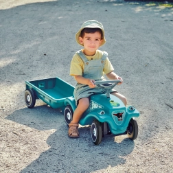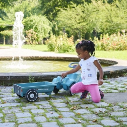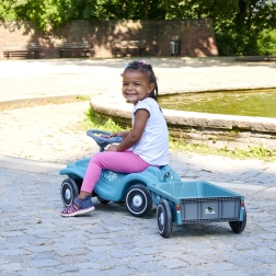 Der abnehmbare Anhänger „Bobby Caddy“ ermöglicht es Kindern, Spielzeug und Kleinigkeiten zu transportieren. Kupplungspunkte vorne und hinten erweitern die Spielszenarien.