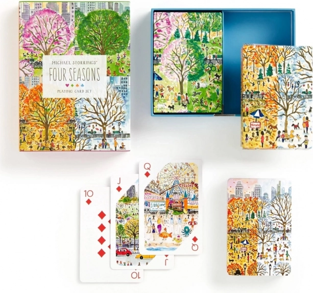Dieses Design-Set bringt eine einzigartige Atmosphäre in Ihre Spieleabende. Jedes Deck ist mit originalen Illustrationen urbaner Szenen und Landschaften verziert, inspiriert von Frühling, Sommer, Herbst und Winter. Zwei vollständige Decks sind in einer stabilen Schubladenbox mit Magnetverschluss für eine einfache und sichere Aufbewahrung untergebracht.