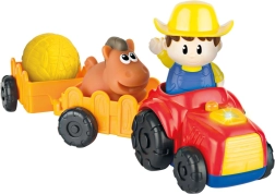 Traktor mit Anhänger, Bauer, Pferd und Heuballen, der spielt und blinkt. Beim Drücken einer Taste leuchtet ein Licht auf und Sie hören lustige Geräusche und Melodien.