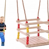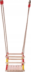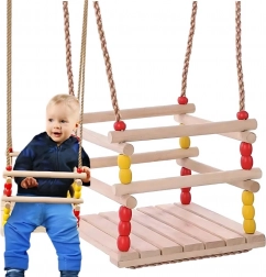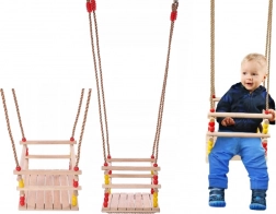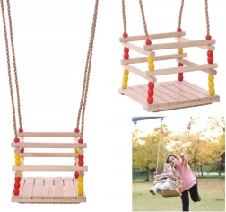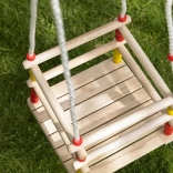 Diese Holzschaukel mit einem Sitz von 30 × 30 cm und vorderem Sicherheitsbügel ist für kleine Kinder konzipiert. Dank glatt geschliffenem Holz ist das Sitzen bequem und angenehm anzufassen. Nach entsprechender Imprägnierung eignet sie sich für Innen- und Außenbereich – Sie hängen sie an einen Baum, eine Pergola oder eine freistehende Konstruktion.