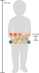 Das Set enthält 28 Holzscheiben mit farbigen, haptisch markanten Füllelementen sowie einen Stoffbeutel zur Aufbewahrung. Dank der kompakten Maße ist es auch unterwegs perfekt – zu Hause, im Kindergarten oder in der Spielecke.
