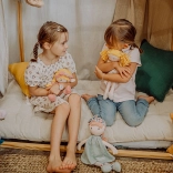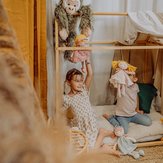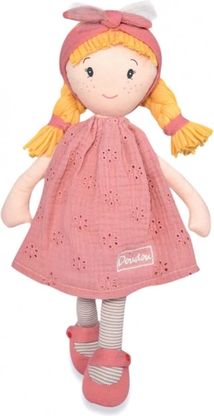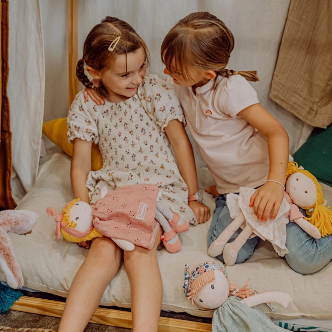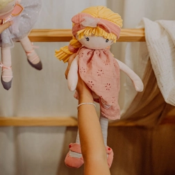 Puppe Suzette in einem rosa Baumwollkleid mit zarten Blumenstickereien, Ballerinas und einem Haarreif mit Schleife regt die kindliche Fantasie und liebevolles Spiel an. Dank der weichen Ausführung eignet sie sich als erste Puppe für Babys und Kleinkinder.