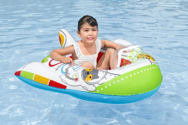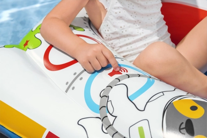 Das Boot ist mit bunten Illustrationen von Raumcharakteren verziert, die für Kinder attraktiv sind.