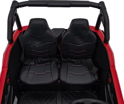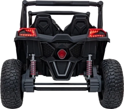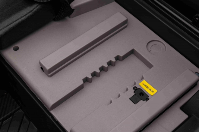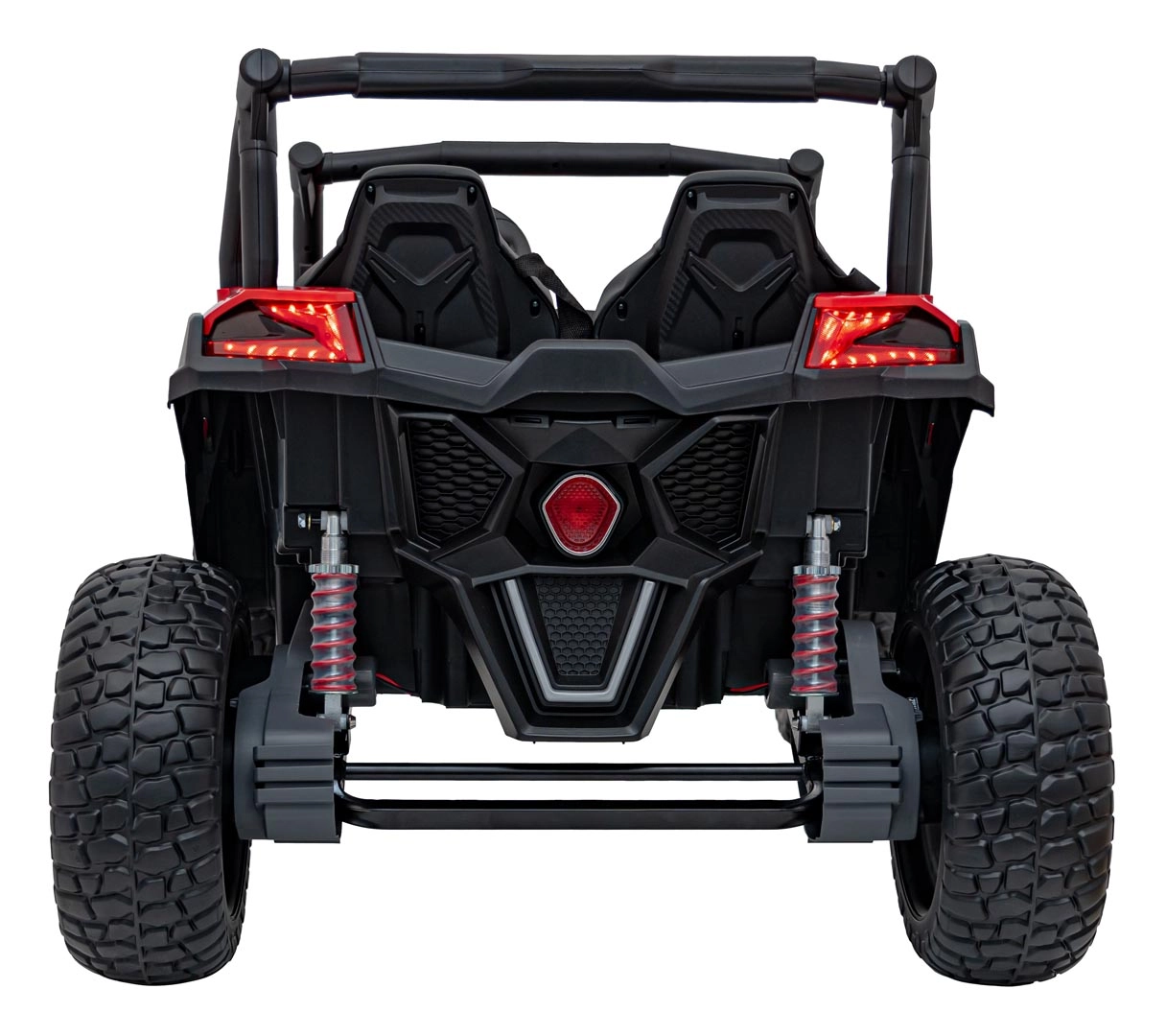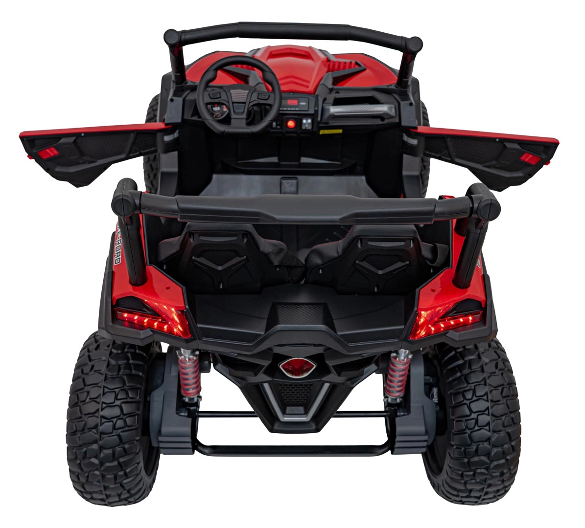 Der Innenraum begeistert mit zwei separaten Sitzen aus schwarzem, atmungsaktivem Eco‑Leder mit 5‑stufiger Einstellung, Sicherheitsgurten und zu öffnenden Türen mit Kindersicherung. Das umfangreiche Multimedia‑Panel mit MP3, USB, Bluetooth und Lenkradgeräuschen sorgt für Unterhaltung auf längeren Fahrten. Die 2,4‑GHz Fernbedienung für Eltern bietet die Wahl aus 3 Geschwindigkeiten und eine Sicherheits‑Stop‑Taste.