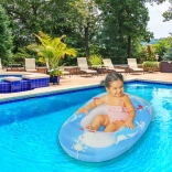 Für Sicherheit und Komfort sorgen der aufblasbare Boden sowie der weiche Rand rundum. Die praktische Zugleine ermöglicht Eltern, das Boot im seichten Wasser heranzuziehen oder zu führen. Im Lieferumfang ist außerdem ein Reparaturflicken enthalten.