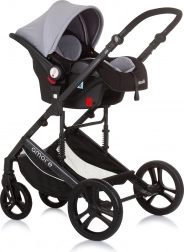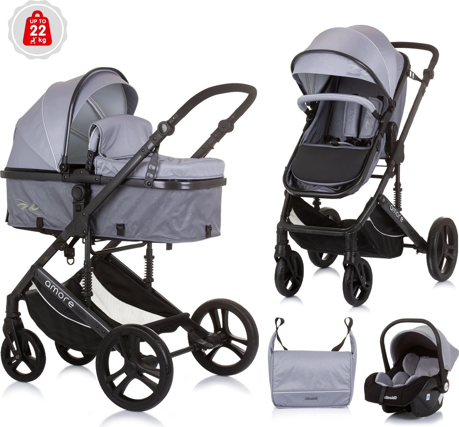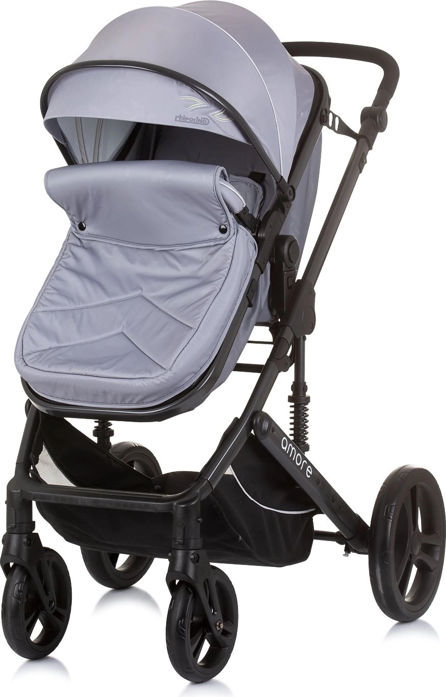 Stilvoller kombinierter Kinderwagen CHiPOLINO AMORE 2-in-1 für Neugeborene bis 22 kg bietet eine leichte Konstruktion, einfache Umrüstung auf die Babywanne, drehbare Sitzeinheit vorwärts und rückwärts sowie umfangreiches Zubehör inklusive Tasche, Fußsack und Flaschenhalter.