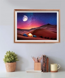 Erkunden Sie die wunderschöne Wüstenszenerie unter dem Sternenhimmel mit einem faszinierenden Farbverlauf von Blau zu Orange. Sie können es nicht nur legen, sondern auch als Kunstwerk genießen, das zum Abenteuer einlädt. Die Abmessungen des gelegten Puzzles betragen 49 x 36 cm und sind ideal für Ihren Arbeits- oder Wohnbereich.