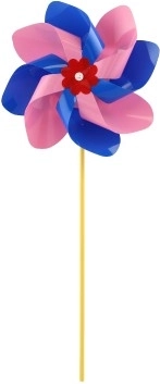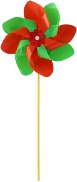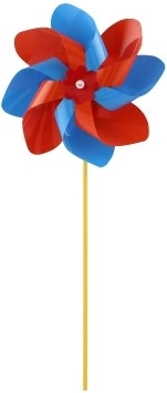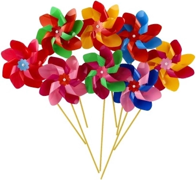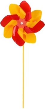 Das Windrad ist aus buntem Plastik gefertigt, dessen leuchtende Farben die Aufmerksamkeit jedes Passanten auf sich ziehen.