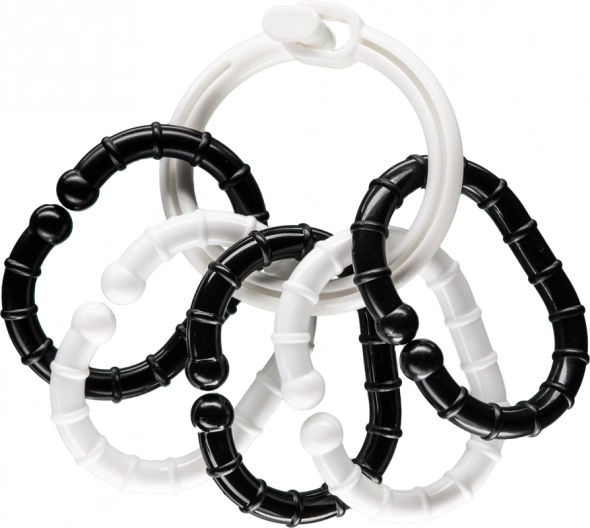 Das kontrastreiche Schwarz-Weiß-Design hilft Neugeborenen, besser zu fokussieren und Formen wahrzunehmen. Die Ringe mit Anhängern sind leicht, liegen angenehm in kleinen Kinderhänden und lassen sich einfach am Kinderwagen, Autositz oder Spielbogen befestigen.
