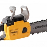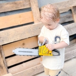 Die Kindersäge sieht durch ihr schwarz-gelbes Farbschema und die funktionalen Bedienelemente wie eine echte Motorsäge aus.