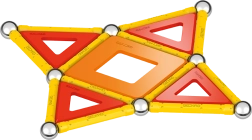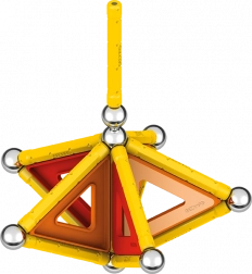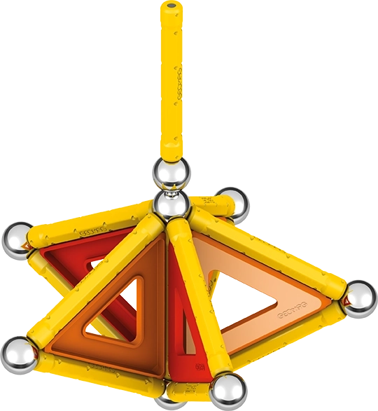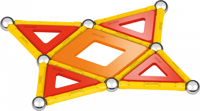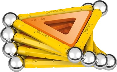 Lieferumfang: 12 gelbe Magnetstäbe, 12 Stahlkugeln, 8 dreieckige Paneele, 2 quadratische Paneele, 1 orangefarbenes Paneel in Fünfeck-Form sowie eine Kunststoffbox für Kugeln und Stäbchen.