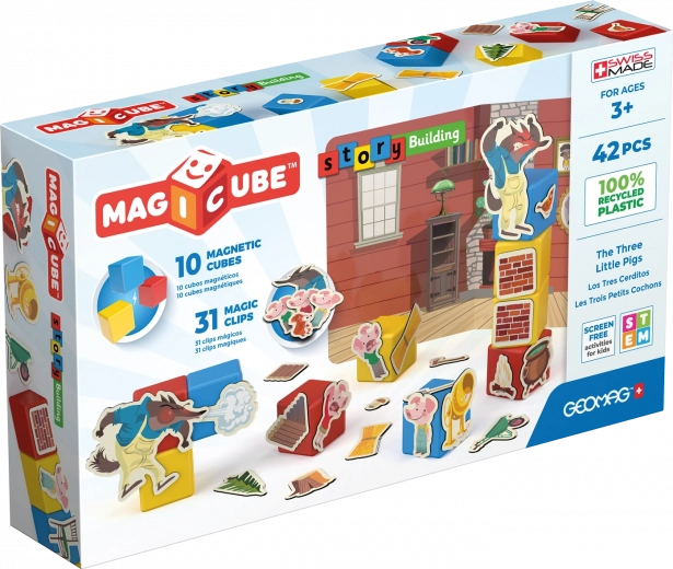 Das Set enthält 10 stabile magnetische Würfel und 31 illustrierte Clips mit Motiven der Schweinchen, des Wolfs und des Hausbaus. So können kleine Kreative die bekannte Geschichte nacherzählen oder sich neue ausdenken. Die Materialien sind gesundheitlich unbedenklich und mit der typischen Schweizer Präzision der Marke Geomag gefertigt.