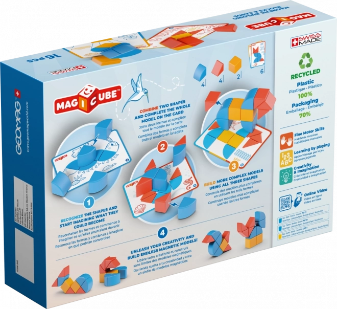 Geomag Magicube Shapes bringt Kindern spielerisch das Kennenlernen von Formen und Konstruktion näher. Dank der cleveren Magnettechnologie ziehen sich die Teile aus verschiedenen Richtungen an, sodass das Bauen intuitiv, macht Spaß und motiviert zu weiterem Entdecken. Im Lieferumfang enthalten sind beidseitige Ideenkarten, die Schritt für Schritt von einfachen Bildern bis zu komplexeren Projekten führen.