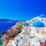 Das Puzzle zeigt die ikonischen blauen Kuppeln und weißen Gebäude von Santorini, die Touristen aus aller Welt anziehen.