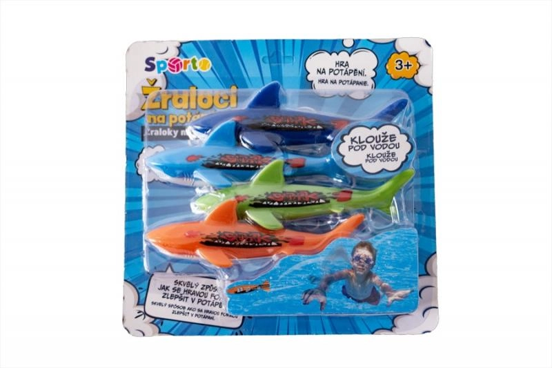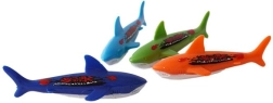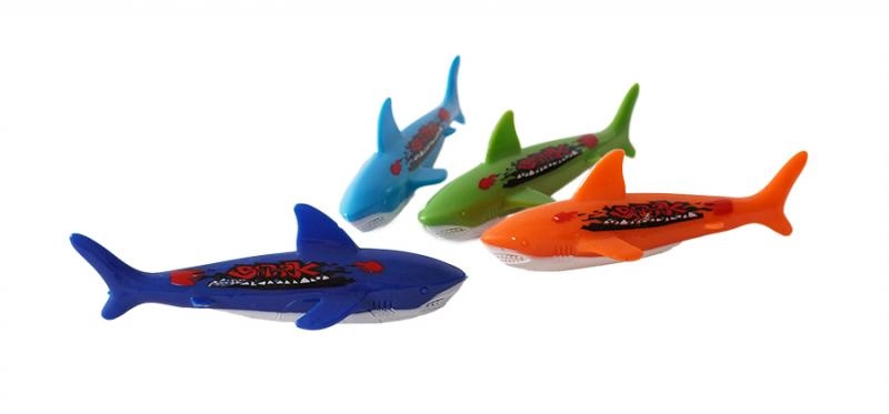 4 bunte Haie, die nach dem Hineinwerfen ins Wasser untergehen und von dir herausgefischt werden müssen.