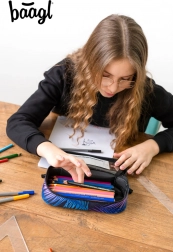 Mit blau-violettem Muster und baagl-Logo, vereint dieses Mäppchen moderne Ästhetik und Funktionalität in einem.