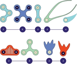 Multidirektionale Teile mit 360°-Rotation und Fixierung in 24 Positionen halten stabil zusammen und ermöglichen standfeste 2D- und 3D-Konstruktionen.