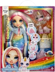 Mit dabei sind ein niedlicher Einhorn-Begleiter und ein gelartiger Slime, den Sie ziehen, drücken und zur Dekoration von Accessoires verwenden können – von der transparenten Handtasche bis zu Plateauschuhen. Nach dem ersten Auspacken genügt ein sanftes Auswaschen der Haare, damit sie weich und glänzend sind. Die Kollektion wird durch beliebte Charaktere wie Violet, Skyler, Jade, Sunny und Ruby ergänzt – sammeln Sie sie alle und erschaffen Sie Ihre eigene Regenbogenwelt.
