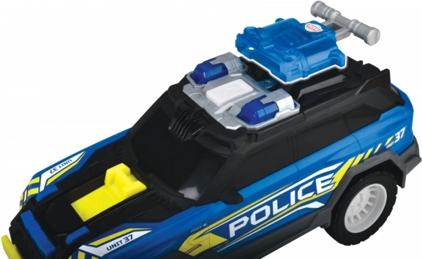 Polizei-SUV ohne Motor, mit Licht- und Soundfunktion. Ausgestattet mit einem Scheibenschleuder und einem ausziehbaren Haken an der Fahrzeugfront. Mit Try-Me-Funktion, Batterien sind im Lieferumfang enthalten. Länge 30 cm, ab 3 Jahren.