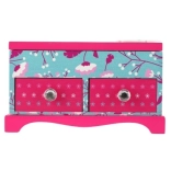 Die Oberfläche ist mit zarten Blumen- und Vogelmotiven in Rosa und Türkisblau verziert und passt wunderbar in jedes Kinderzimmer. Dank der stabilen Holzausführung und der griffigen, leichtgängigen Bedienelemente ist es für Kinder einfach zu handhaben. Kein Spielzeug – geeignet als dekorativer Aufbewahrungsgegenstand.