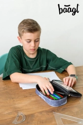 Dieses stylische Etui im grau-blauen Weltraumdesign mit NASA-Logo bietet eine clevere Aufteilung für den Schulalltag. Die aufklappbare Trennwand mit elastischen Schlaufen hält Stifte ordentlich an ihrem Platz, während die Reißverschlusstasche ideal für Kleinigkeiten ist.