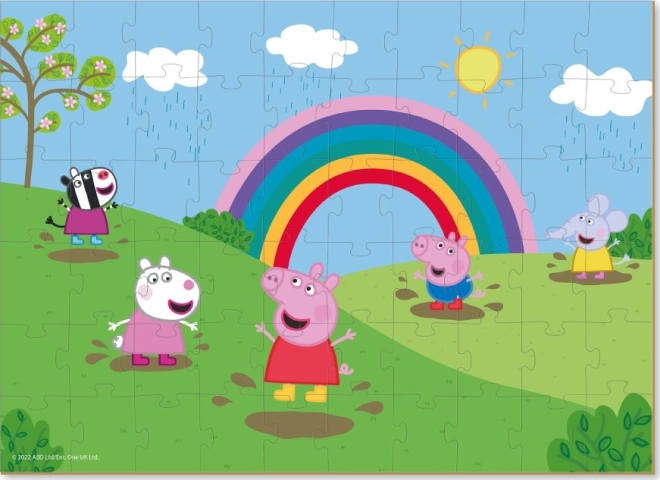 Entdecke ein buntes Abenteuer mit dem Puzzle Peppa Wutz: Regenbogenfreude. Dank 60 stabiler Teile macht das Puzzeln Kindern Spaß und trainiert dabei Konzentration und Vorstellungskraft. Das fertige Bild mit den Maßen 32 × 23 cm eignet sich perfekt zum Ausstellen im Kinderzimmer.