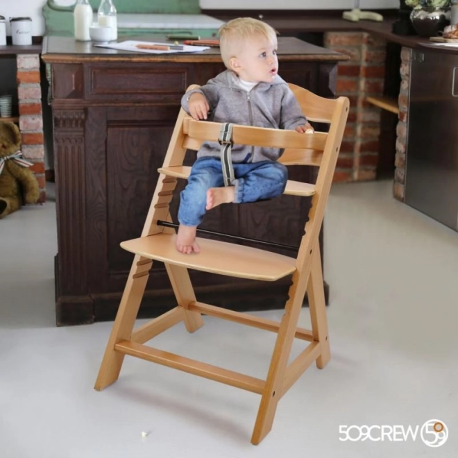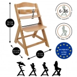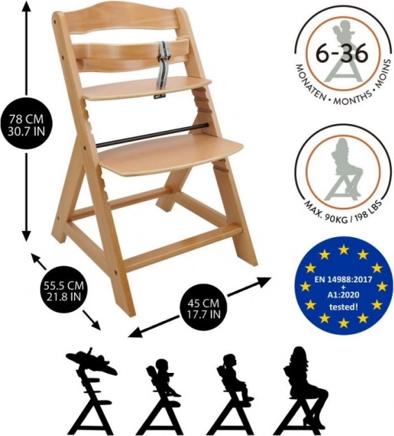 Der Holz Hochstuhl ist für maximalen Komfort und Sicherheit von Kindern ab sechs Monaten konzipiert. Er verfügt über mehrstufige Höhenverstellungen von Sitz und Fußstütze, sodass er vom frühen Kindesalter bis zum Erwachsenenalter genutzt werden kann. Bei älteren Kindern können die vordere Stange und der Schrittteiler entfernt werden, und der Stuhl kann in einen normalen Stuhl umgewandelt werden. Er ist aus hochwertigem deutschem Buchenholz gefertigt und bietet Stabilität und Eleganz. Seine maximale Tragfähigkeit beträgt bis zu 90 kg.